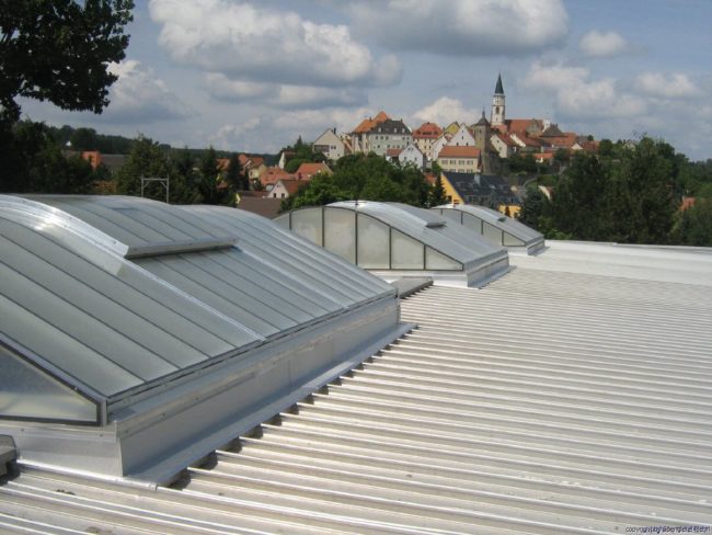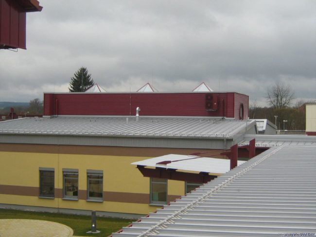 High School Vilseck: 360 qm Kalzipdächer über mehrere Gebäudebereiche komplett mit belüfteten Wandanschluss.