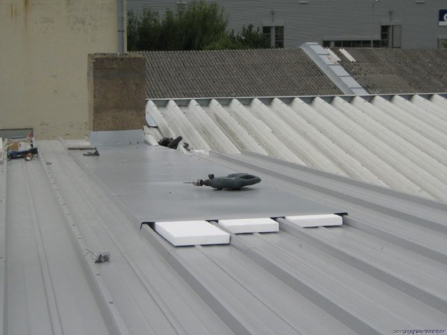 Bus-Halle in Eschenbach: Schleppblech von Kamineinfassung bis First und trittfester Dämmung auf Thermodach verlegt.