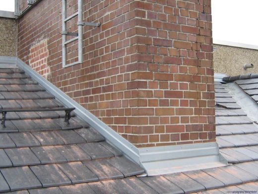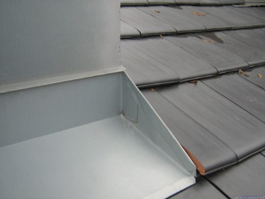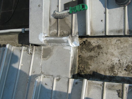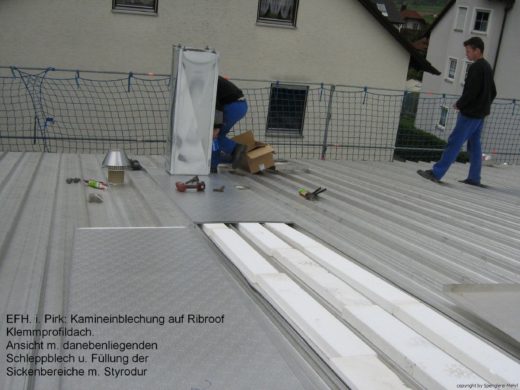 Bus-Halle in Eschenbach: Schleppblech von Kamineinfassung bis First und trittfester Dämmung auf Thermodach verlegt.
