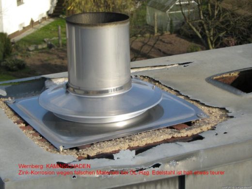 Wernberg: Kaminschaden – Zink-Korrosion wegen falschen Materials bei Ölheizung. Edelstahl ist halt etwas teuerer.